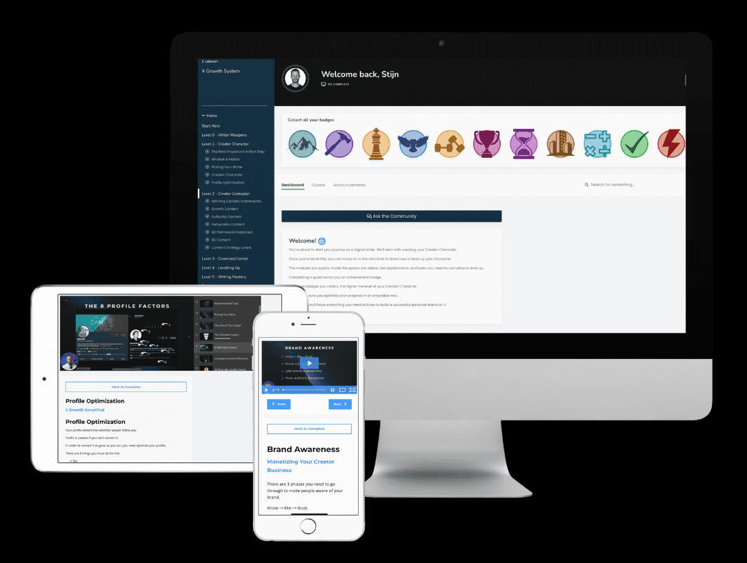 2) Show you how to build a massive audience and email list full of high-quality people to sell to.This is everything you need to build a successful creator business via Twitter (X).It cost me years of trial and error to create this system.I spent $20K+ on mentors and courses and I made 6-figures last year.But you can get the best lessons I learned for a fraction of this price.And it'll save you hours per day of having to figure it out by yourself.I've learned from people like Dan Koe, Justin Welsh, JK Molina, Ed Lawrence, Chin Gregory, Hamza Ahmed, Kieran Drew, Dakota Robertson, Lara Acosta, Creator Karro, and many more.They taught me strategies, processes and systems that most people in the creator economy have never even heard of.And on top of that, I've spent thousands of hours on learning, experimenting, and creating new strategies by myself.These are strategies that even the people I mentioned above aren't teaching.It's on the current edge of knowledge and it has given me, my 600+ customers, and 70+ clients great results.Right now, these strategies are leading to amazing results but it may not always stay like that because the creator economy is constantly evolving.However, I will keep updating this course with the best strategies I learn so you have lifetime access to this.My strategies only used to be available in my high-ticket program, but right now, you can get them in this course for the first time.And there's a good chance this won't be available ever again soon.This is the last creator business course you'll ever need.I'm confident to say that because I have taken 30+ courses and this course contains the best strategies of all of them.Combined with everything I learned after spending thousands of hours creating content and building my creator business.So let me quickly show you what you'll get.
